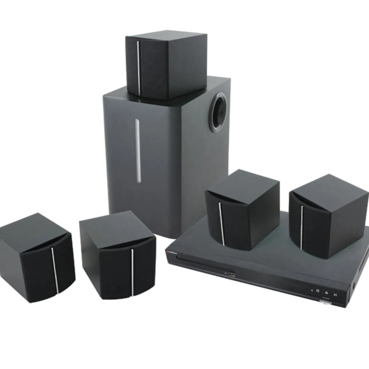 Home cinéma compatible DVD, VCD, CD, MP3, JPEG …, enceintes satellites 5×5 W et caisson de basses 15 W, lecteur DVD HDMI, USB, sortie coaxiale, système audio 5.1, télécommande.