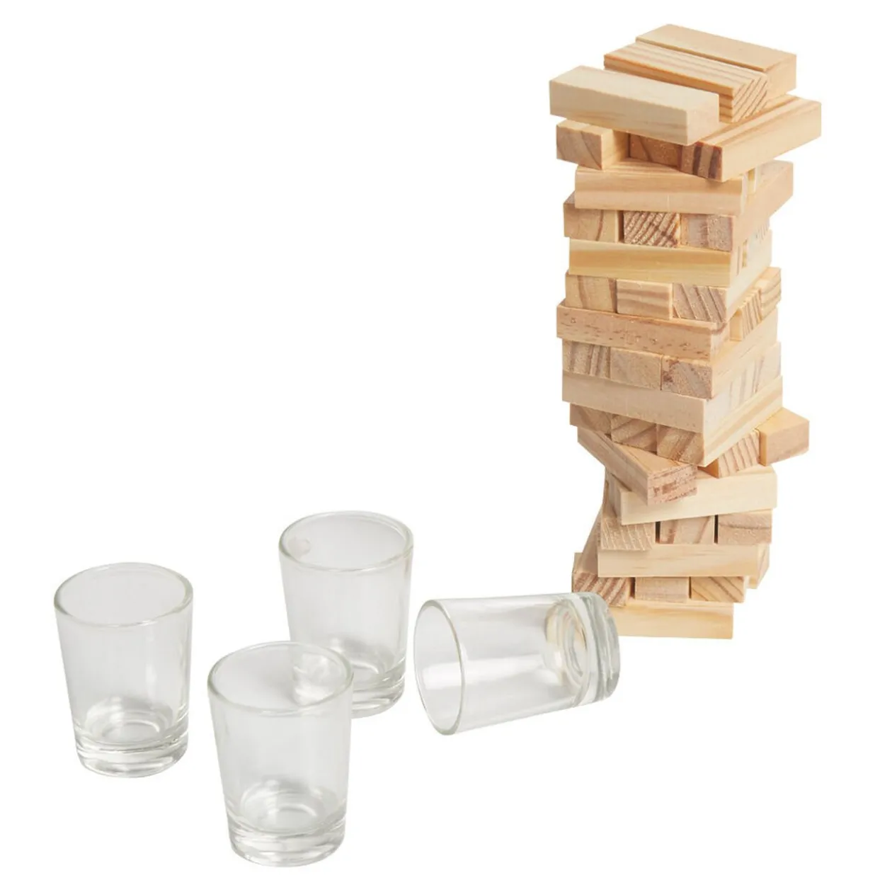 Jeu de boisson la tour infernale comprenant une tour de briques en bois et 4 verres.