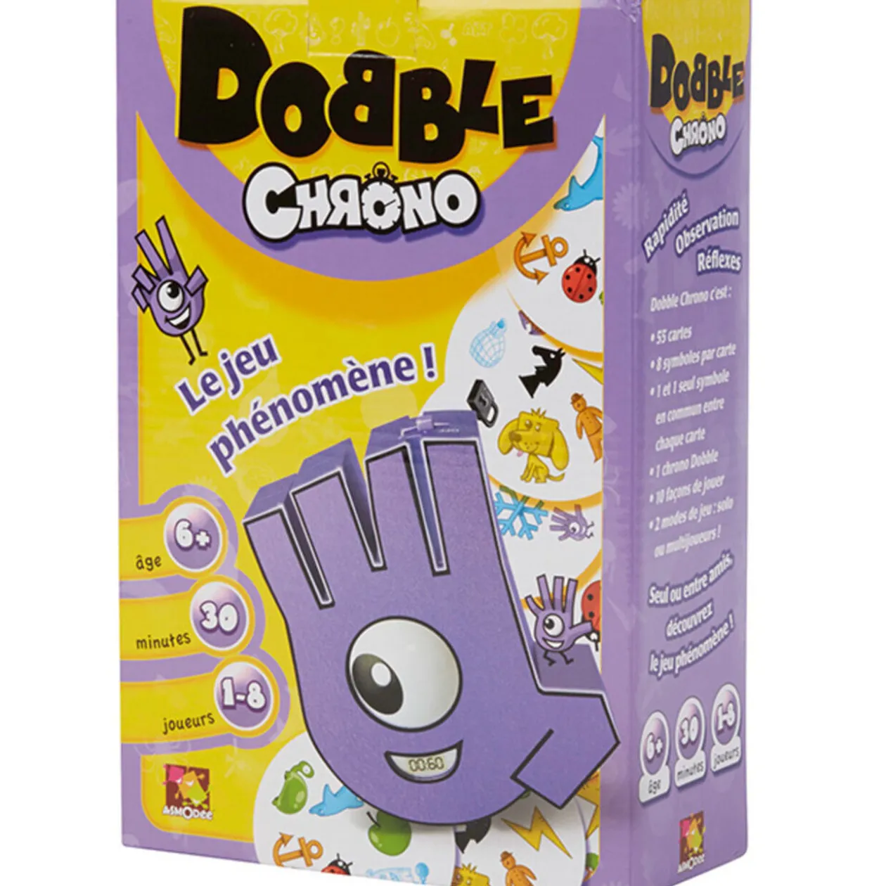 Dobble Chrono est un jeu de rapidité, d’observation et de réflexes. 30 minutes de jeu, de 1 à 8 joueurs. Dès 6 ans.