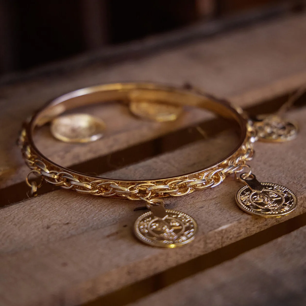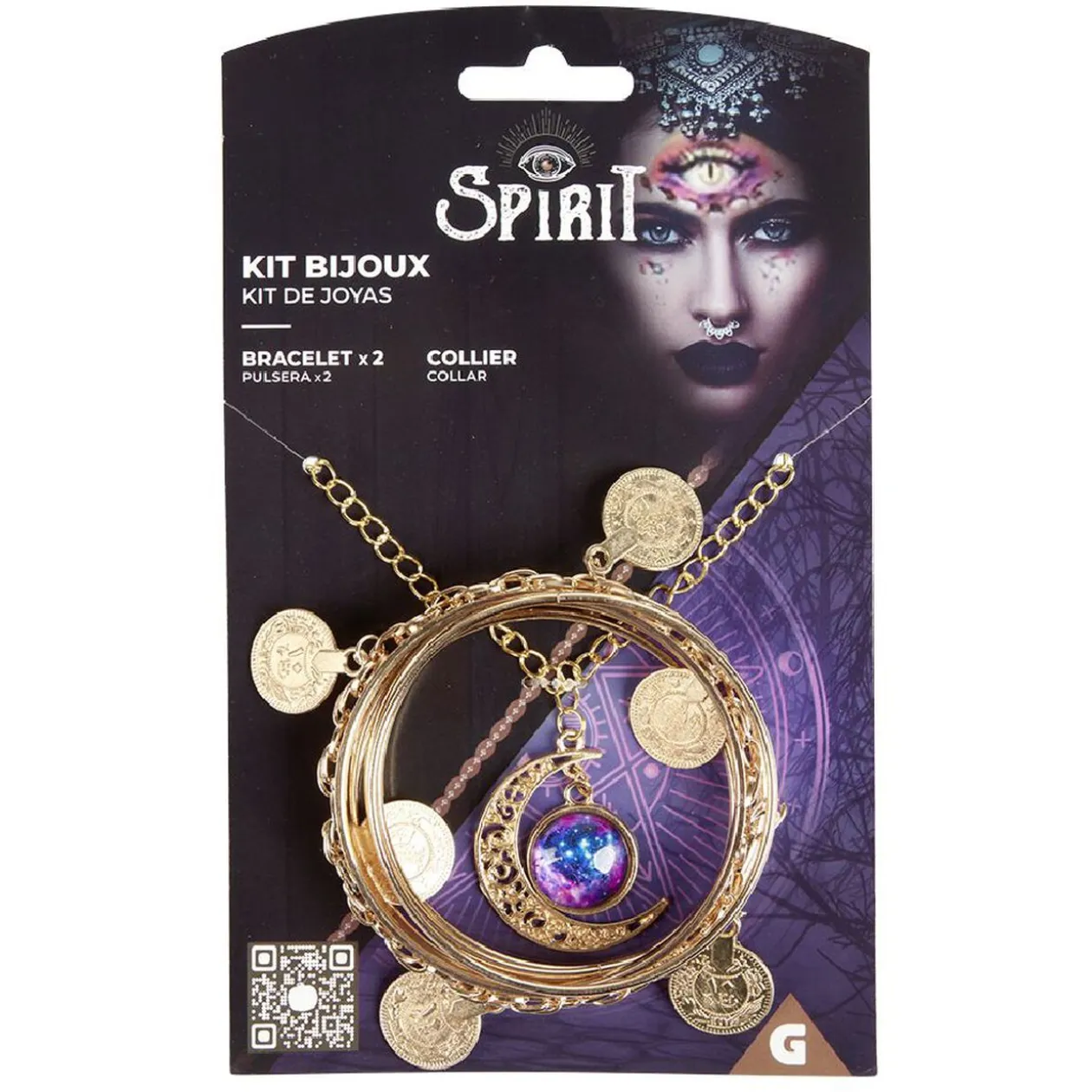 Un kit de bijoux comportant un collier et 2 bracelets dorés. Idéal pour compléter un déguisement d’Halloween.