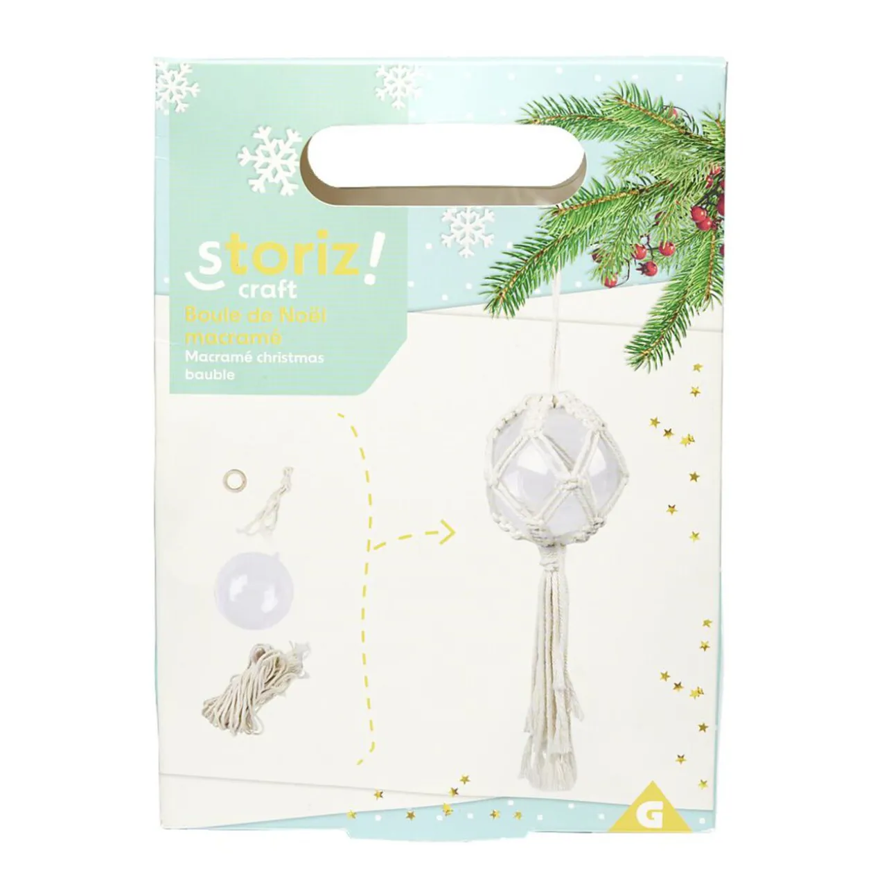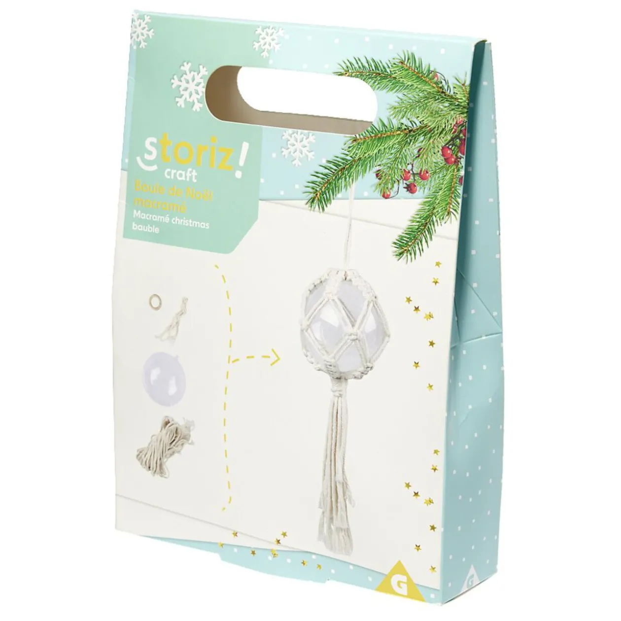 Ce kit de création permet de réaliser une boule de Noël en macramé, idéal pour créer des décorations festives uniques et personnalisées.