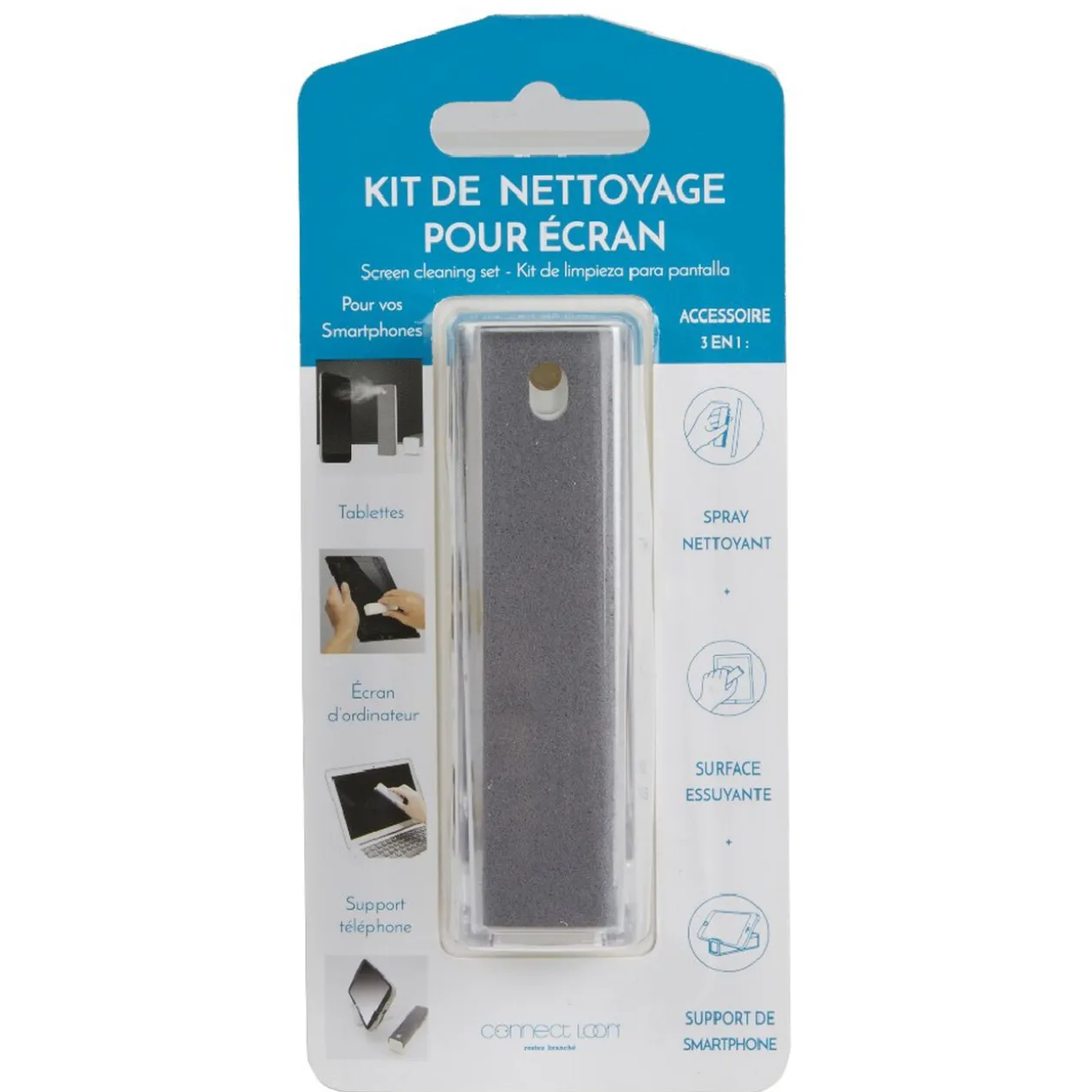 Vous pourrez emmener ce kit partout avec vous! 3 en 1: spray nettoyant, brosse et support smartphone