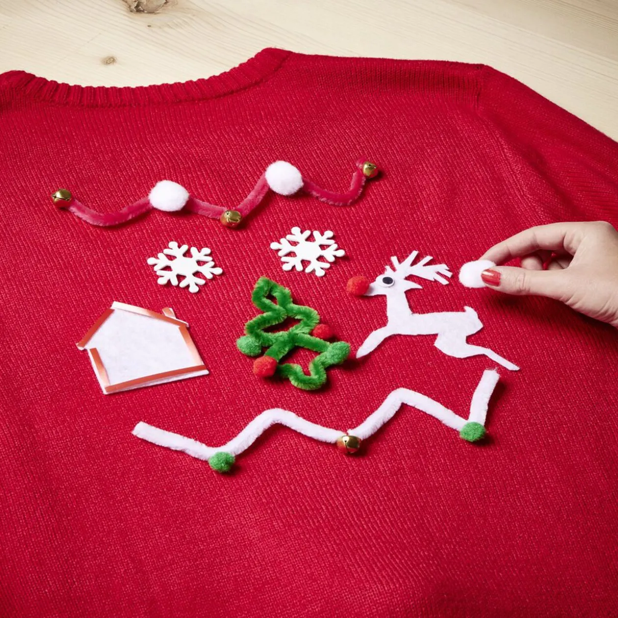 Personnalisez vos pulls de Noël avec ce kit composé de chenilles, pompons, formes et yeux.