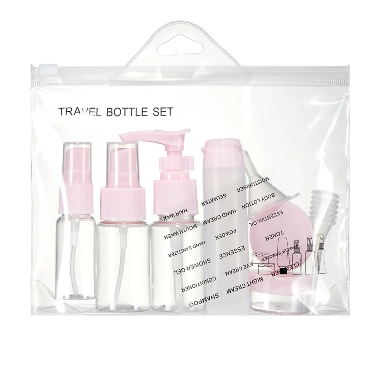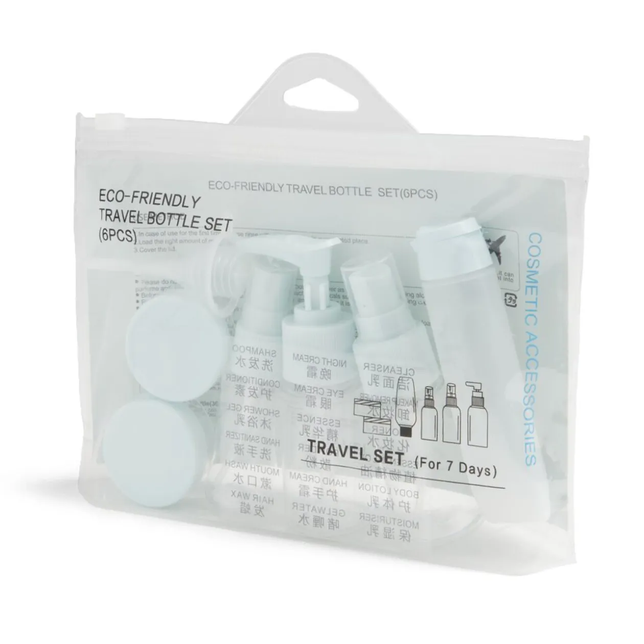 Optimisez votre voyage avec ce lot de 6 flacons comprenant 1 tube pour crème, 2 sprays, 1 flacon pour crème et 2 étuis à lentilles, le tout accompagné d’une trousse pratique en plastique transparent.