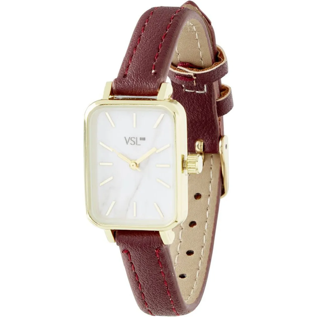 Montre carrée dorée sur fond blanc avec bracelet simili rouge bordeaux, parfaite pour garder un oeil sur l’heure et habiller joliment votre poignet.