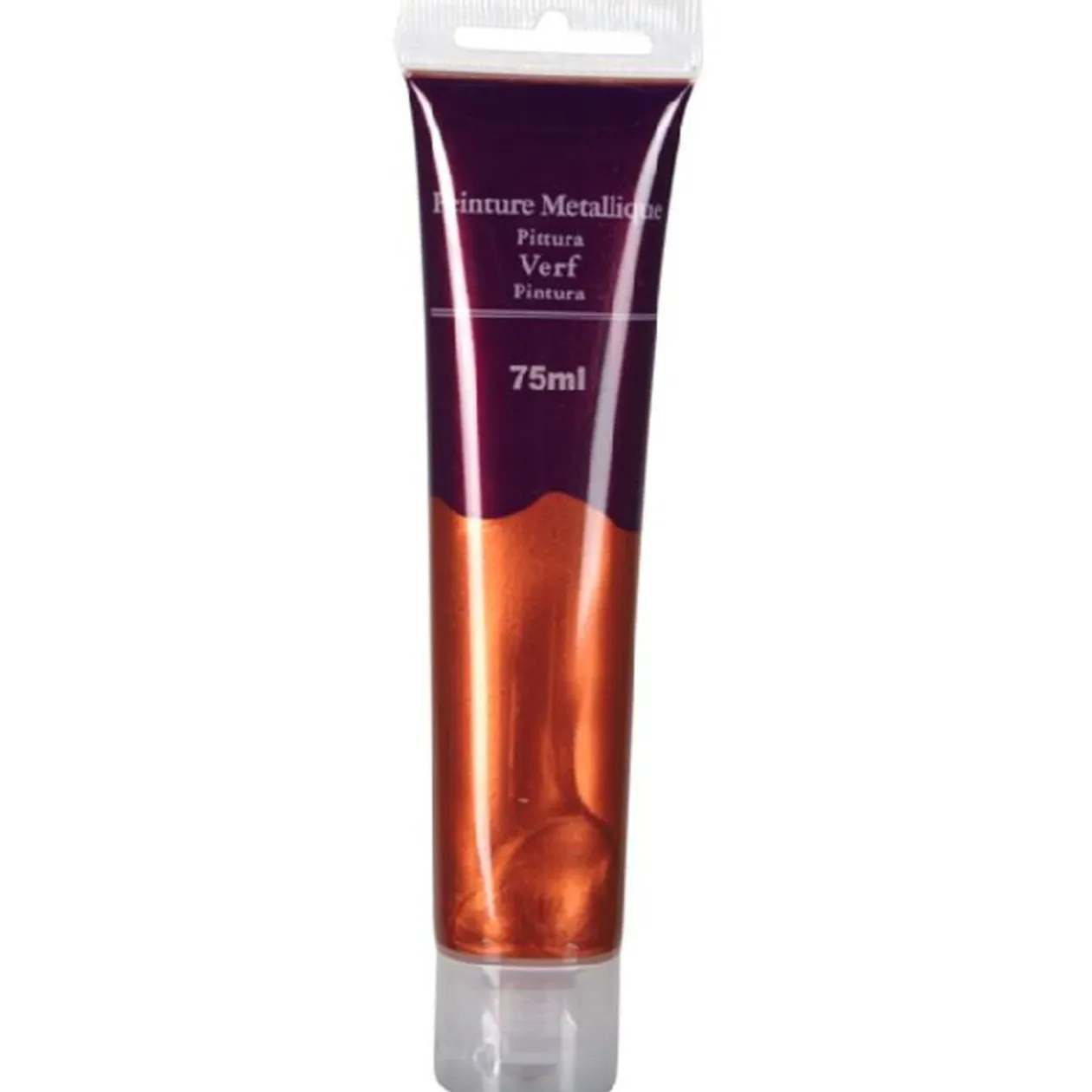 Tube de peinture métallique de couleur cuivre, d’une contenance de 75 ml.