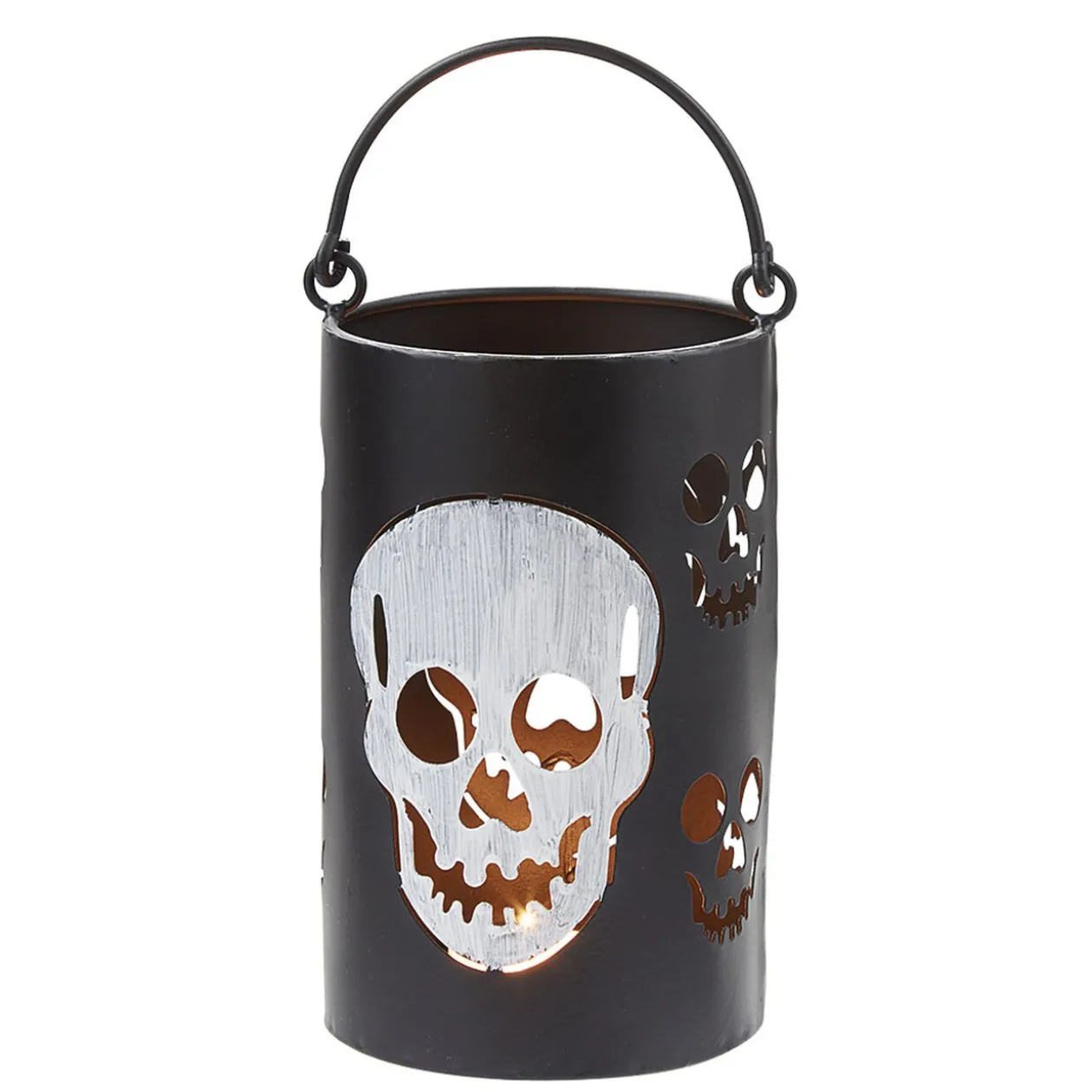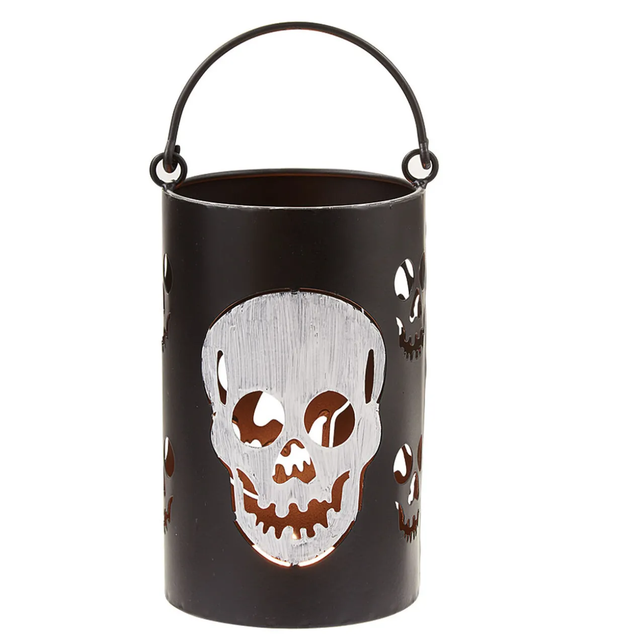 Photophore ajouré noir avec motif tête de mort grise. Idéal pour Halloween !