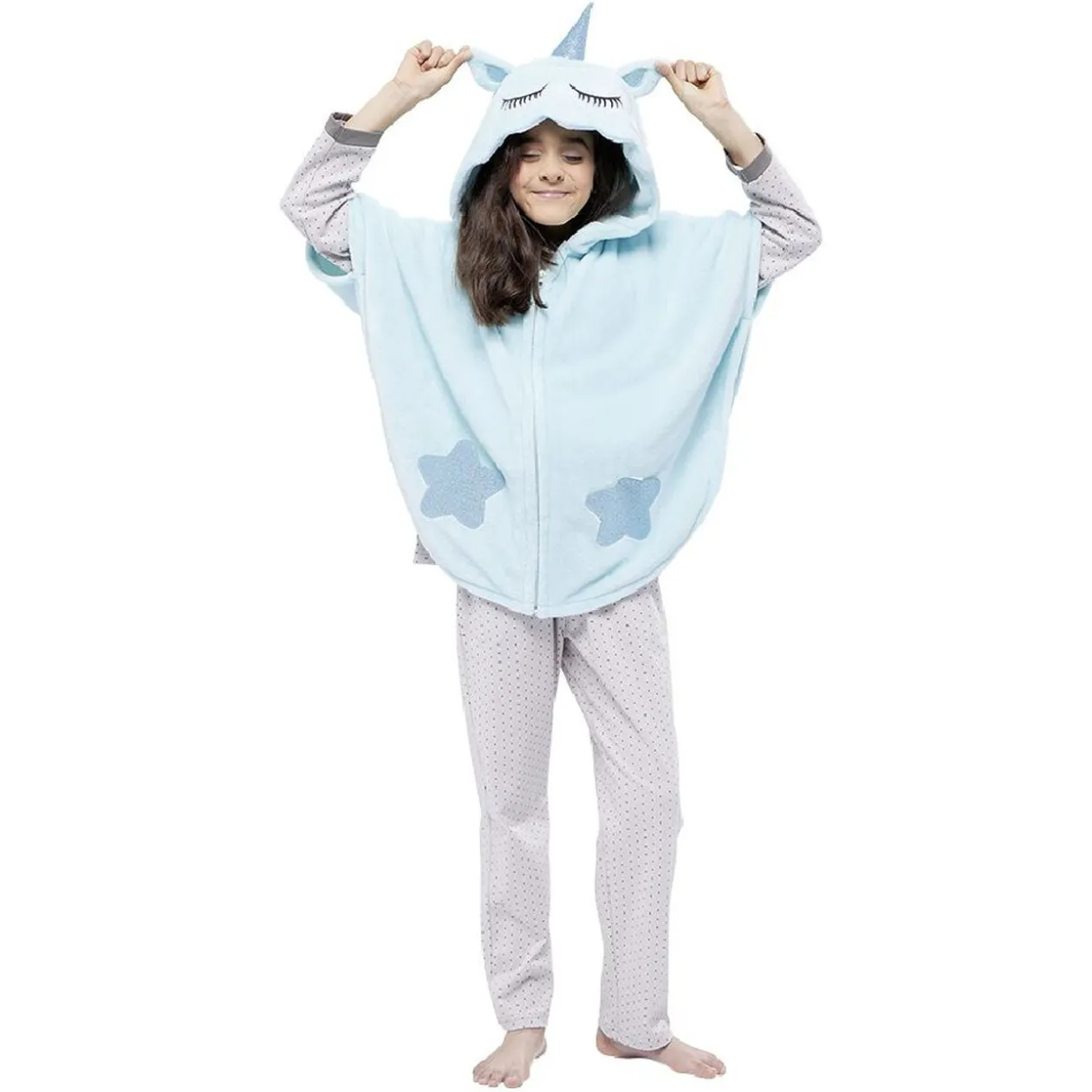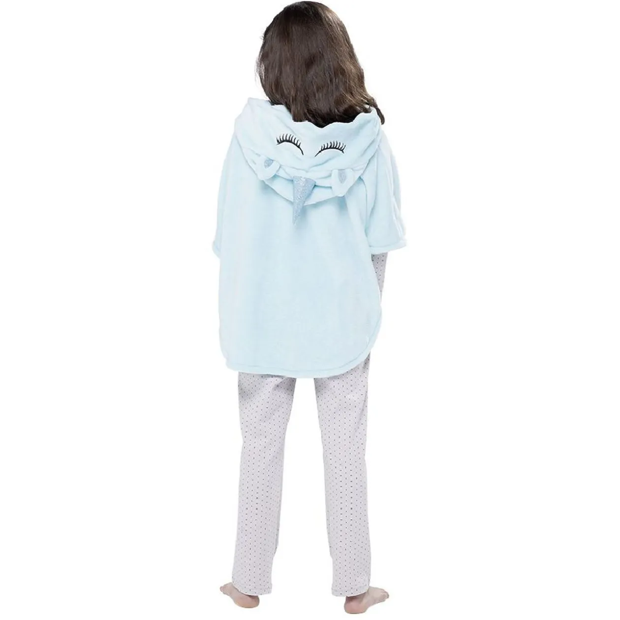 Cet adorable poncho bleu sur le thème des licornes saura vous tenir chaud lors des soirées fraiches.