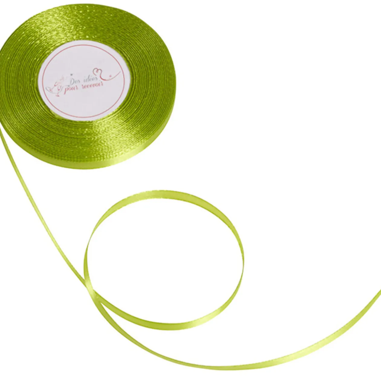 Ruban satin vert anis en polyester, longueur 25 m, largeur 0,6 cm. Peut s’utiliser en décoration pour mariage ou autre évènement.