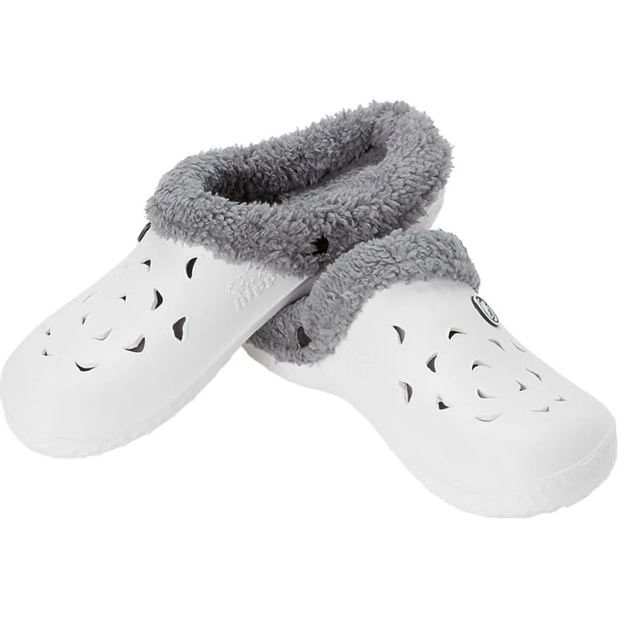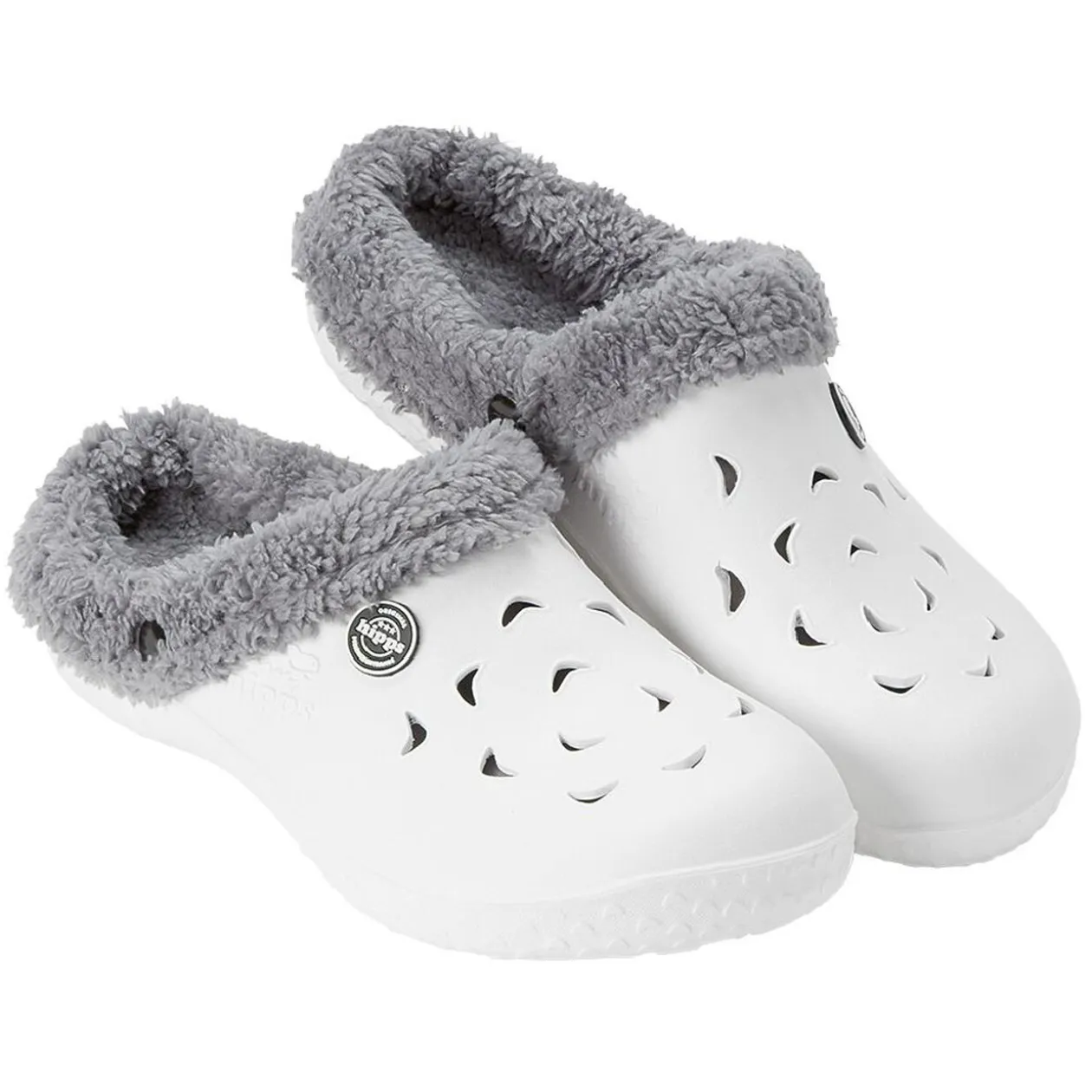 Paire de sabots Hipps en plastique de couleur blanc et fourré textile gris foncé à l’intérieur.