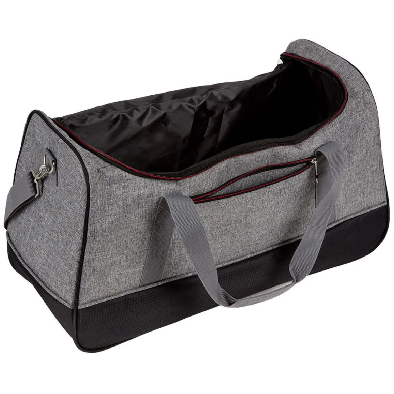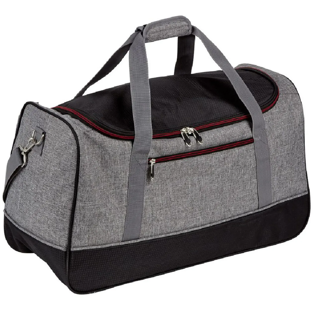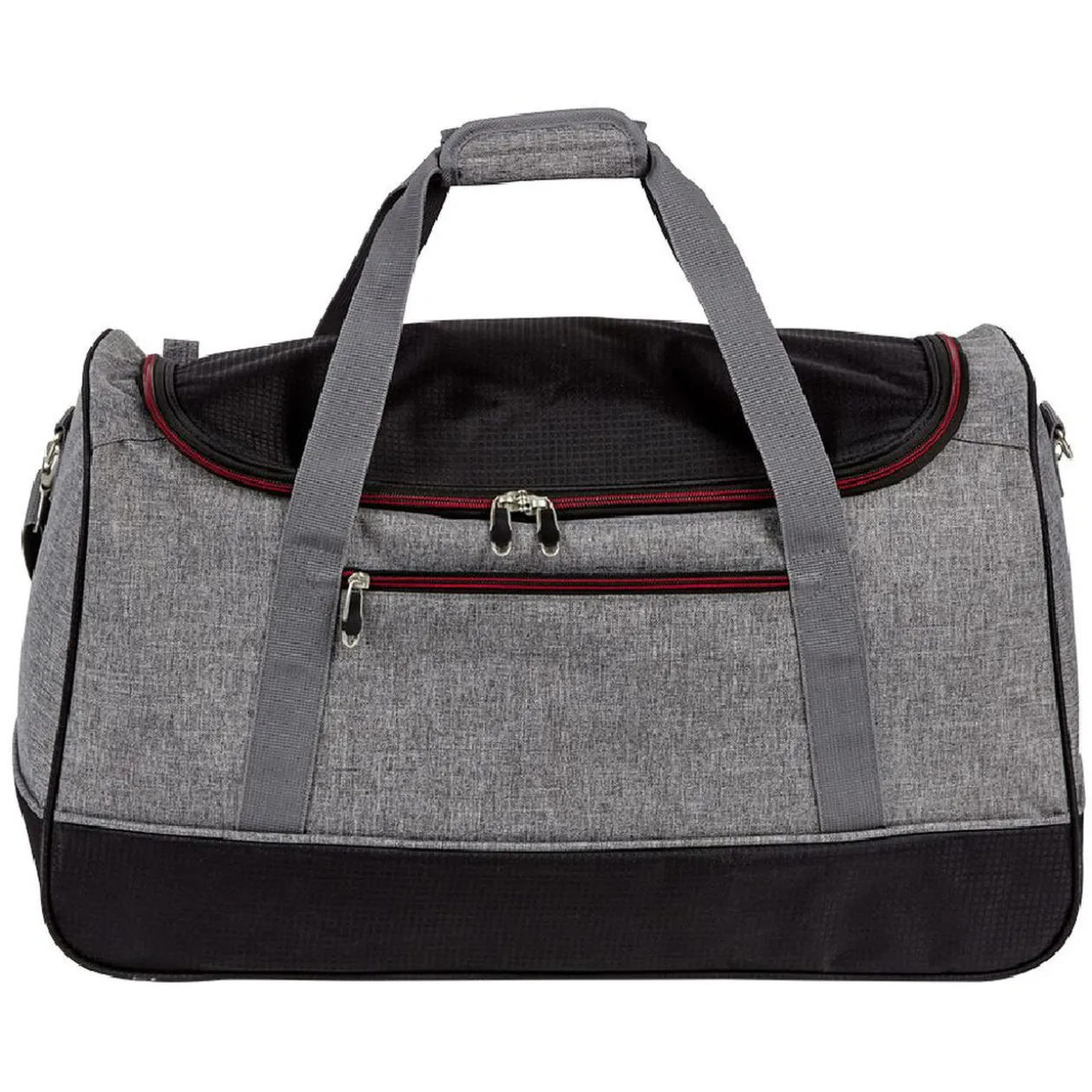 Sac de voyage de couleur grise et noire avec fermeture à glissière rouge.