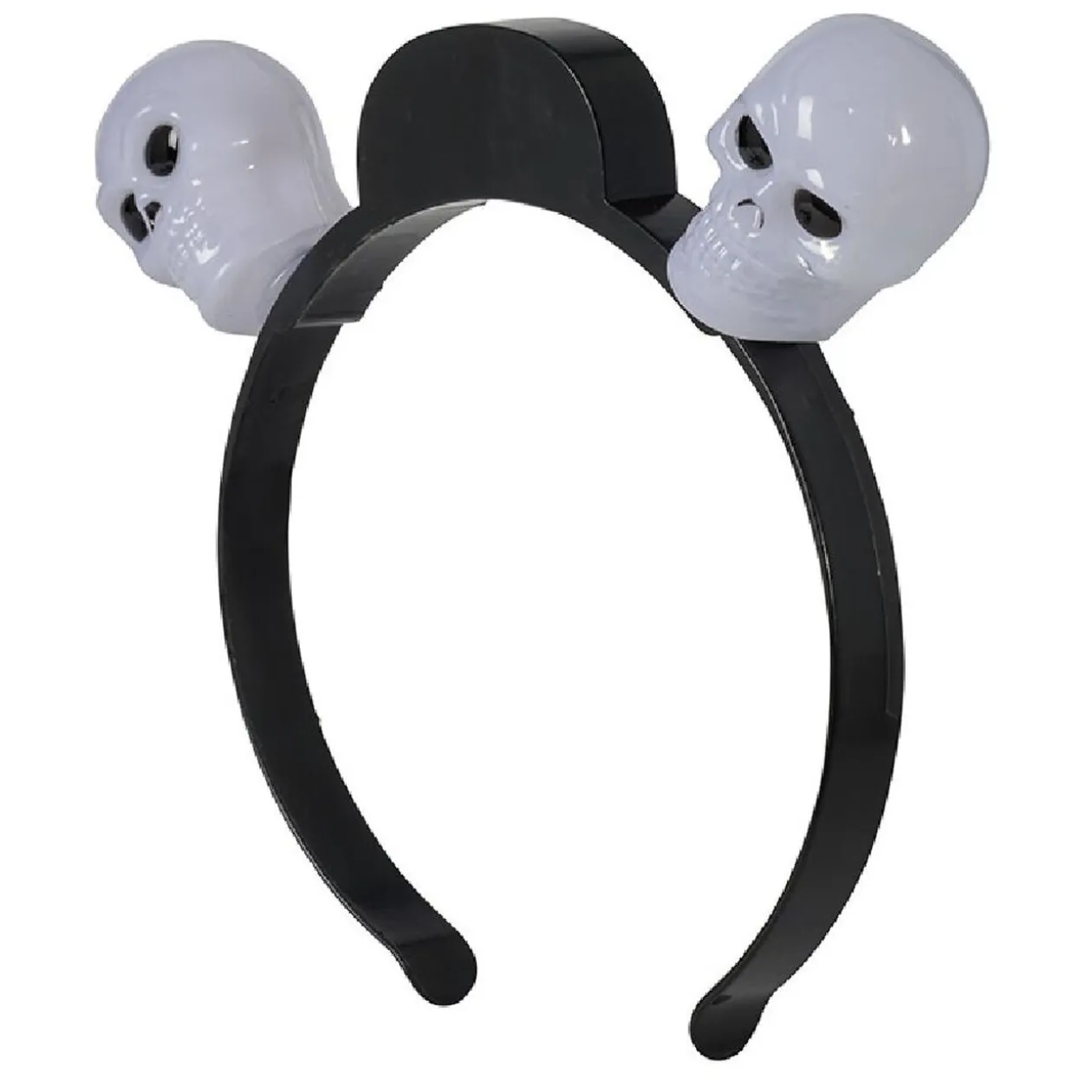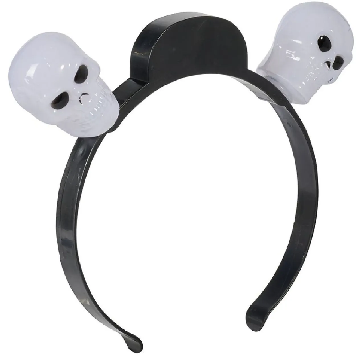 Serre-tête noir avec 2 crânes blancs lumineux, idéal pour Halloween.