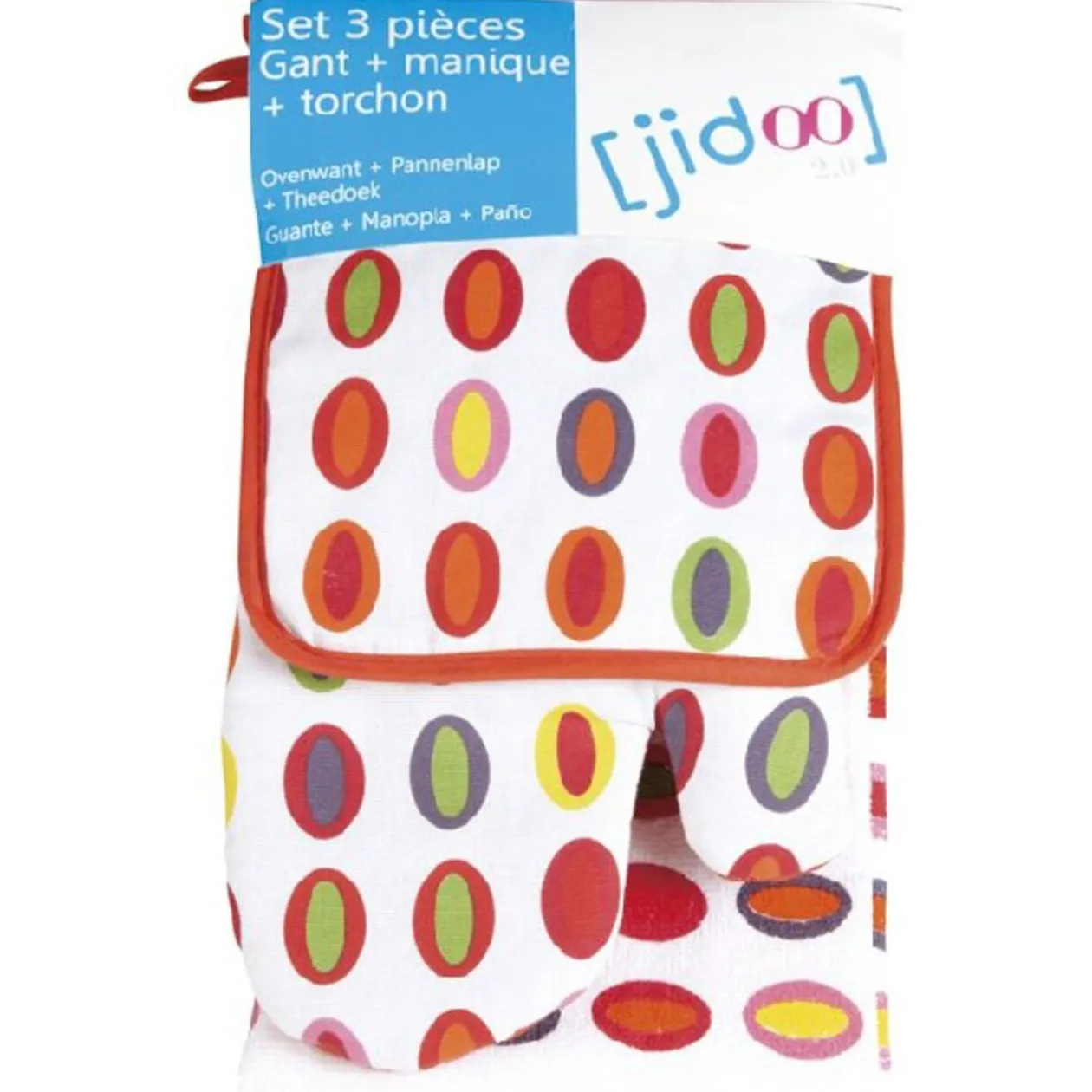 Set cuisine comprenant : 1 torchon dim. 38×63 cm 100 % coton, 1 manique dim. 18×18 cm et 1 gant dim. 17×29 cm, 50 % coton, 50 % polyester.