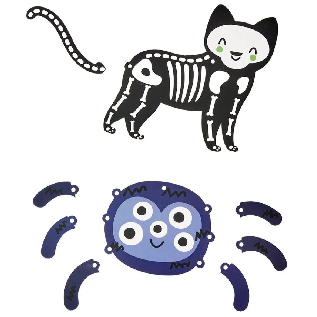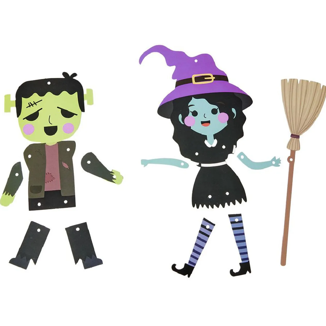 Set de pantins articulés à assembler comprenant une sorcière avec balai, un monstre Frankenstein, une araignée, une citrouille et un squelette chat.