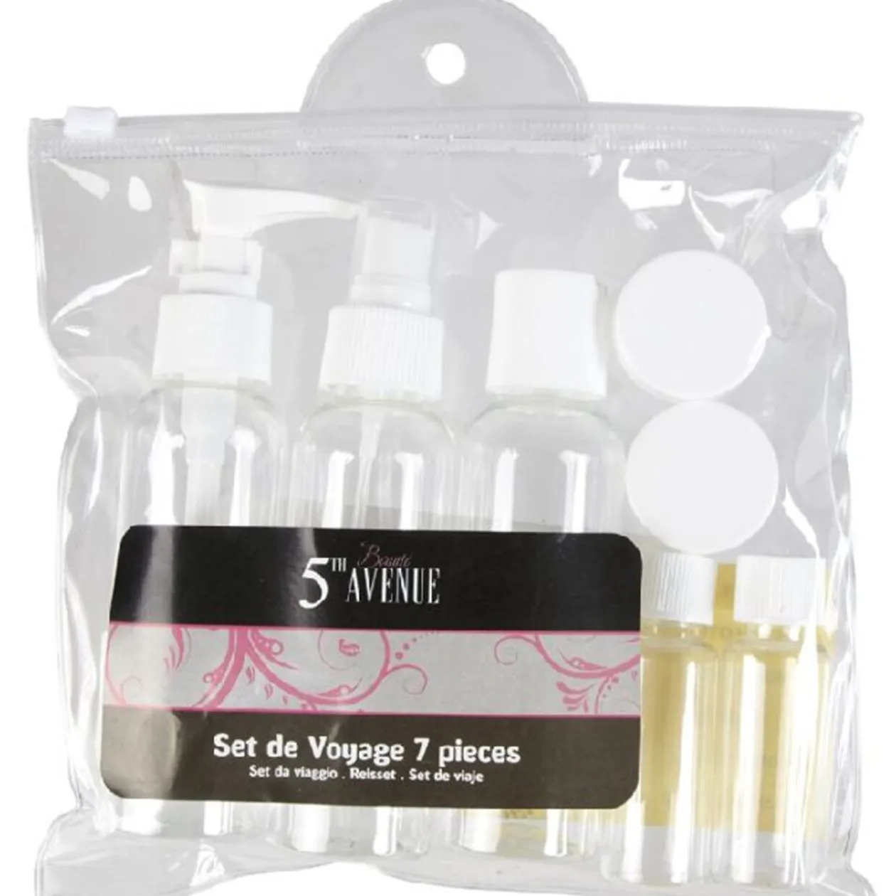 Comprend : 1 pochette, 1 distributeur cont. 100 ml, 1 pulvérisateur cont. 100 ml, 1 bouteille cont. 100 ml, 2 petites bouteilles et 1 pot à crème, plastique.