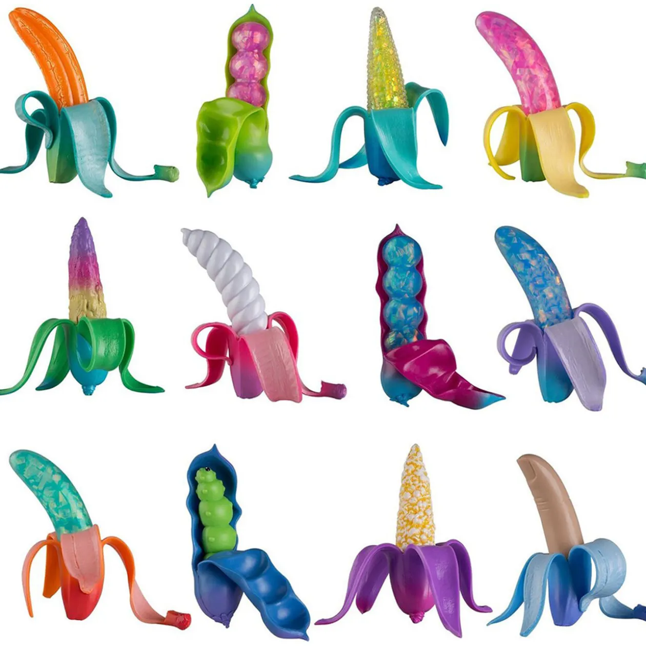 Drôle et amusante, cette banane squishy contient une surprise à l’intérieur. Tomberas-tu sur de la glace, un épi de maïs, des pois, une chenille, du pop-corn ? Pèle ta banane et découvre-le.