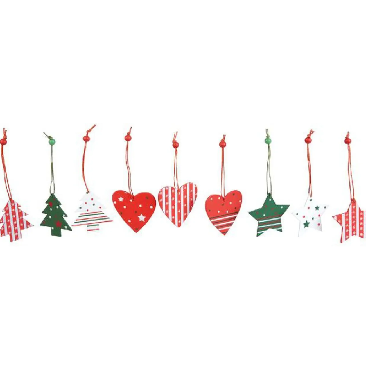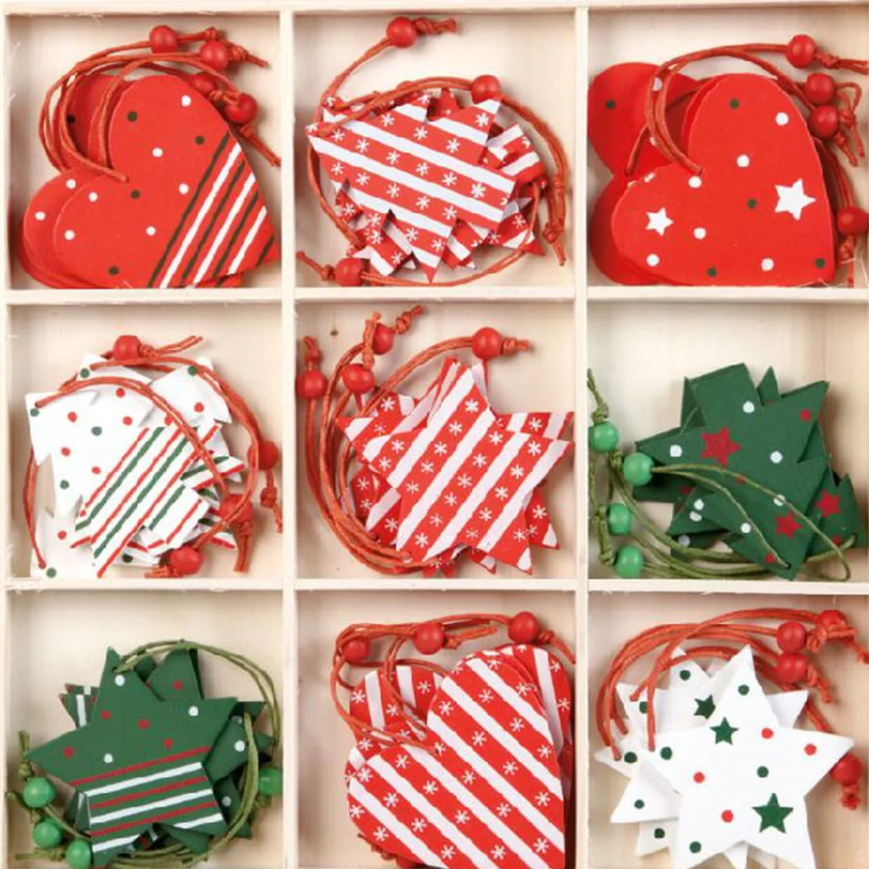 Bois. 36 décorations de Noël rouges, vertes et blanches, bois, à suspendre, dans boîte de dim. 21x21x1.5 cm.
