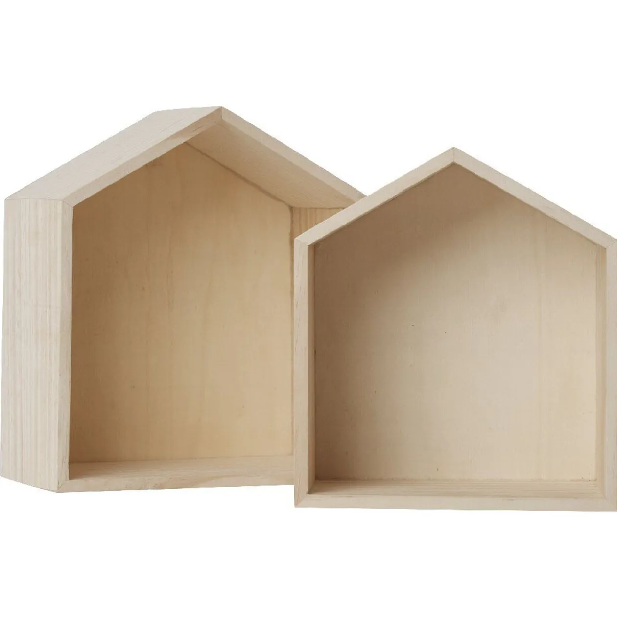 2 maisons, objet de décoration à suspendre, de couleur bois naturel. Crochets inclus.