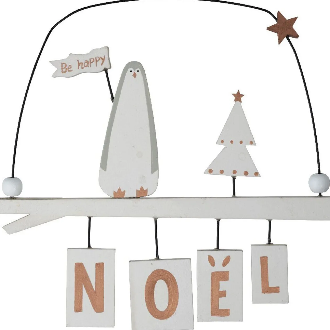 Cette suspension déco Pingouin et sapin blancs avec inscription NOËL en lettres dorées est idéale pour souhaiter de bonnes fêtes à vos convives.