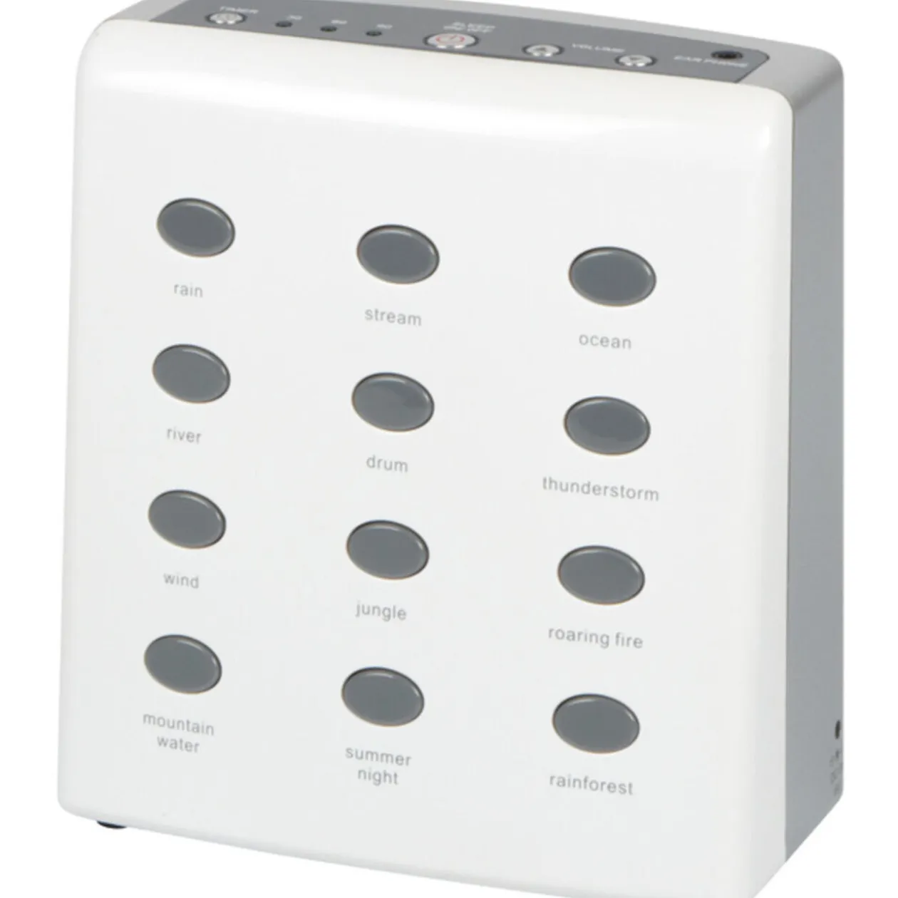 Système de thérapie du sommeil fonctionnant à la fois sur batterie ou sur secteur, adaptateur inclus, 12 sons de la nature différents, minuteur 30/60/90 minutes, compatible avec des écouteurs..