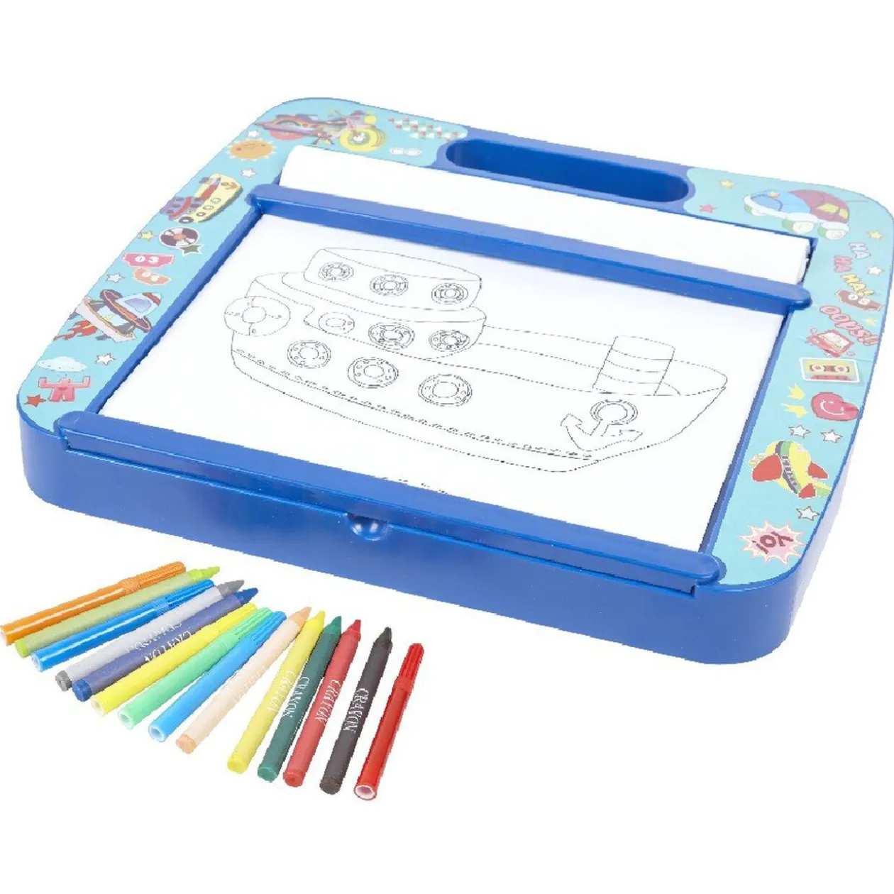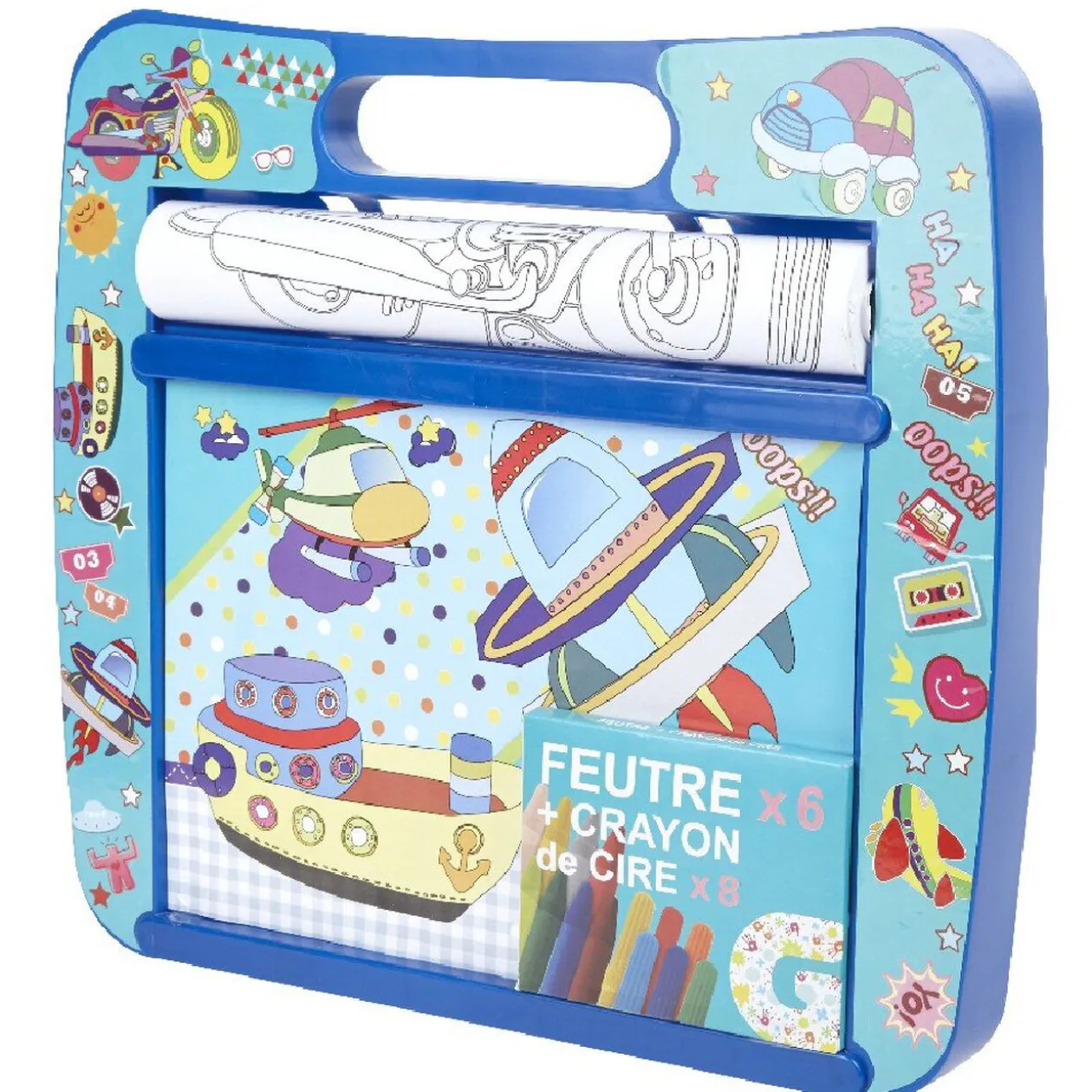 Comprend 1 rouleau pré-dessiné 10 m, 6 feutres, 8 crayons de cire et tiroirs de rangement.