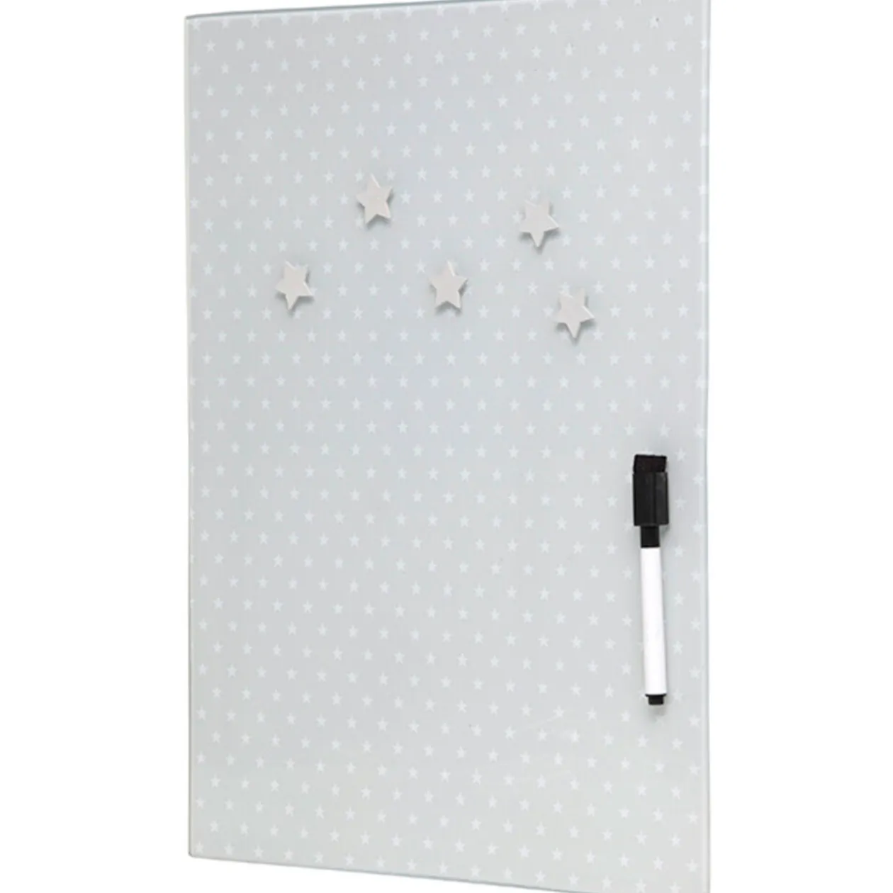 Tableau mémo en verre design étoiles, dim. 30×40 cm. Stylo et 5 aimants inclus.