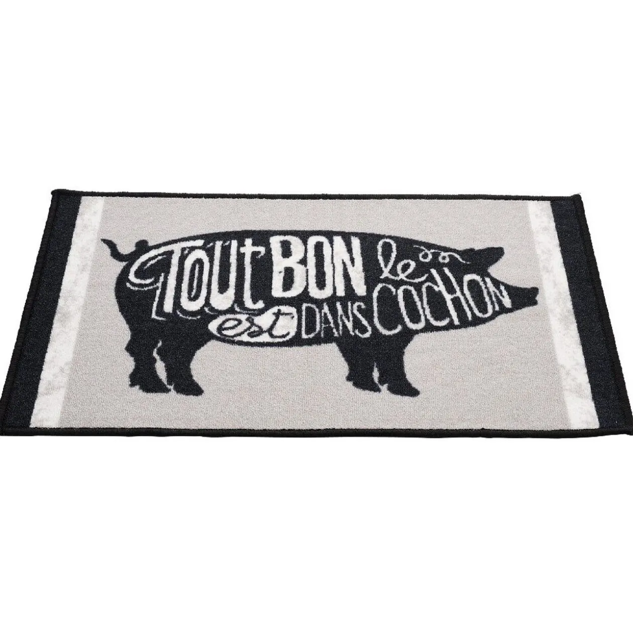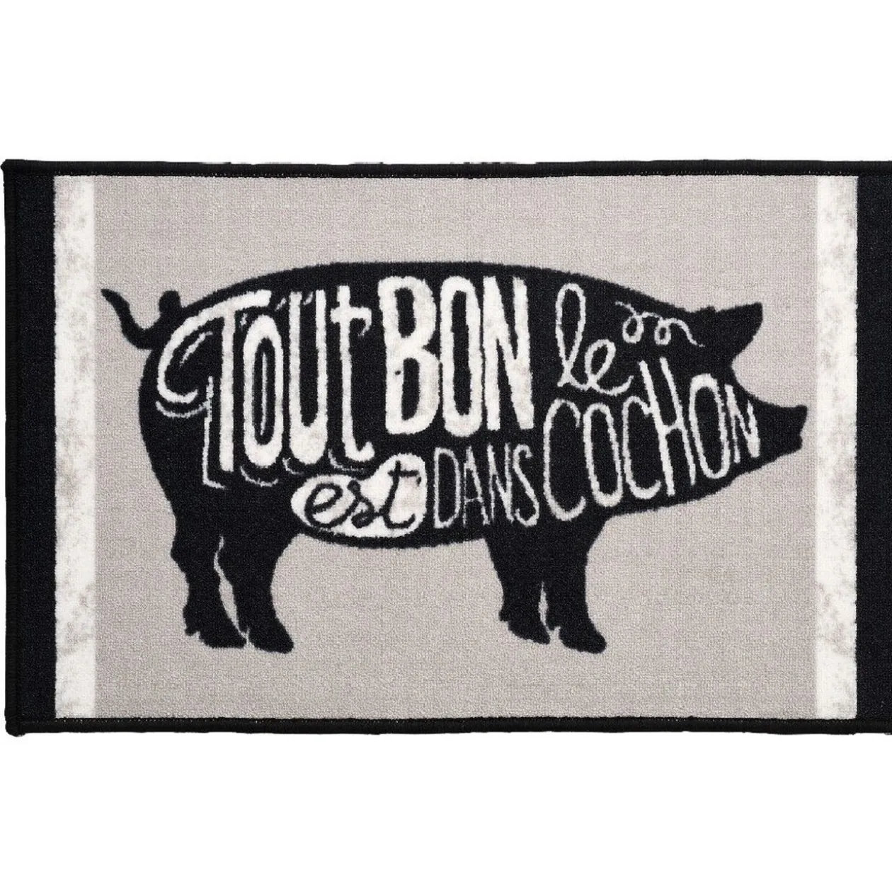 Tapis de cuisine avec inscription « Tout est bon dans le cochon » de couleur noir, gris et blanc, moyen format.