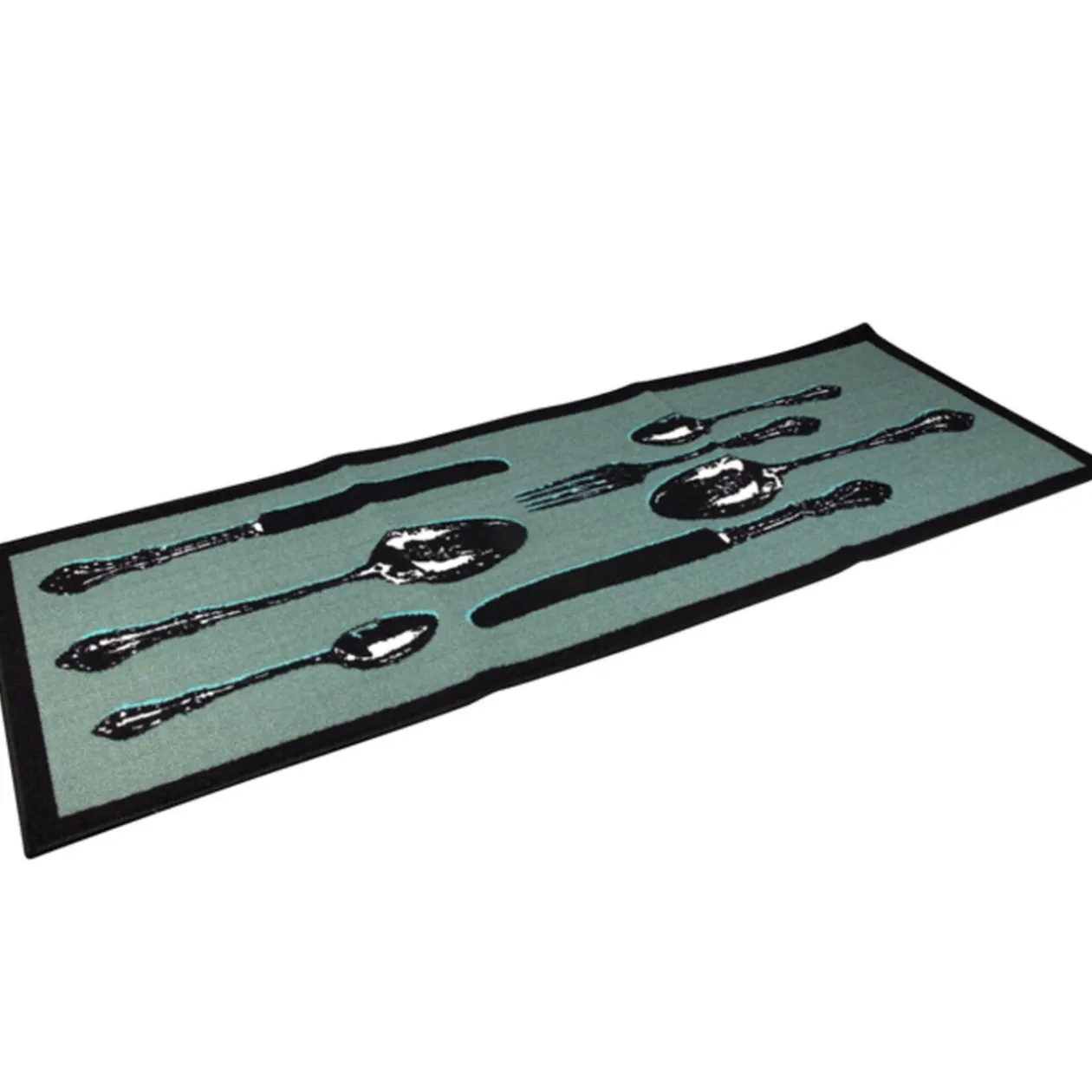Tapis de cuisine grand modèle design couverts, dim. 57×150 cm, dessous latex, dessus polyamide.