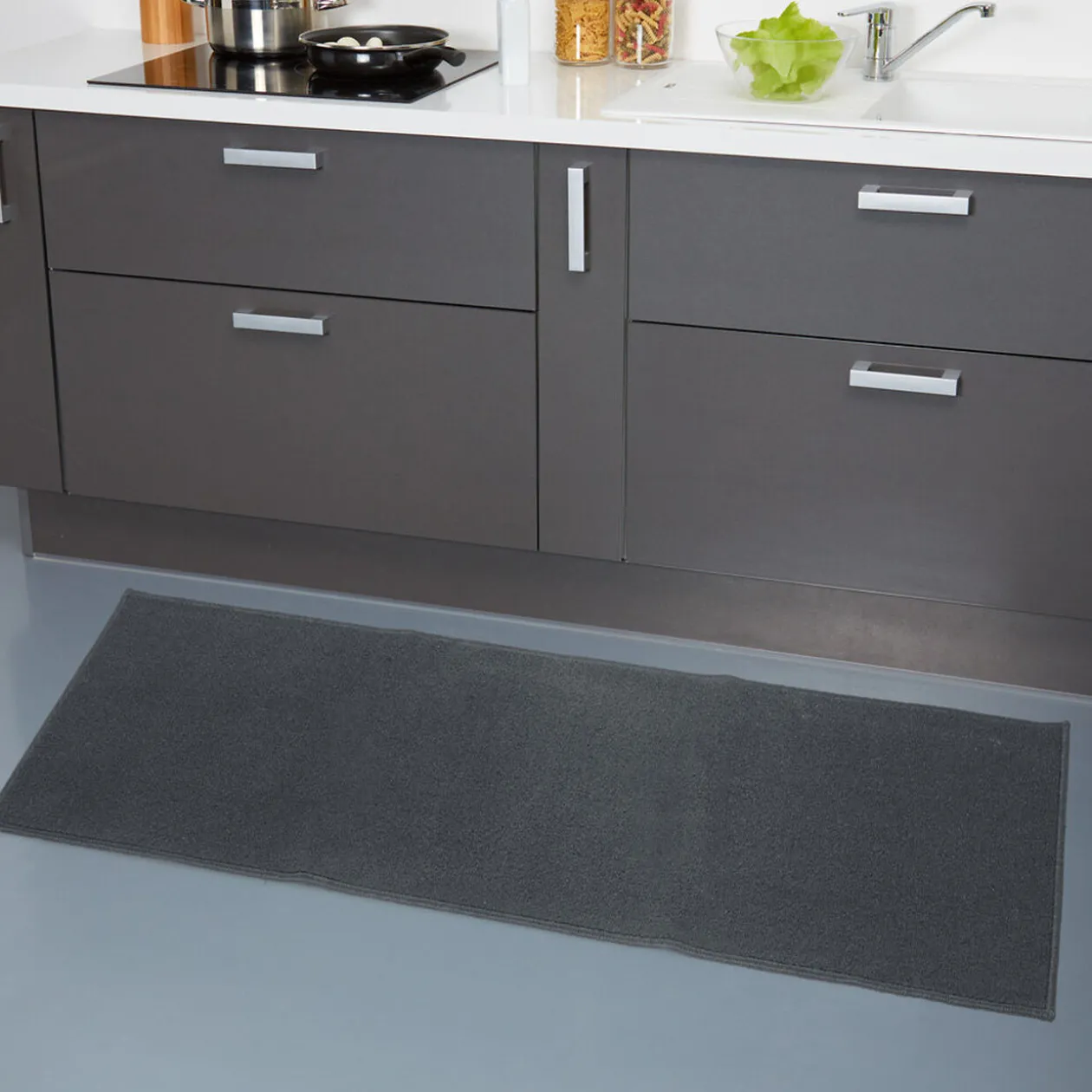 Tapis de cuisine gris de taille XXL en polypropylène avec dessous antidérapant en latex.
