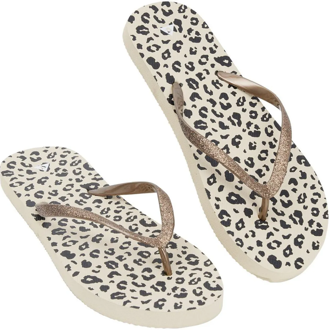 Cette paire de tongs avec brides pailletées marron et semelle motif léopard beige et noir est idéale pour flâner en intérieur comme extérieur.