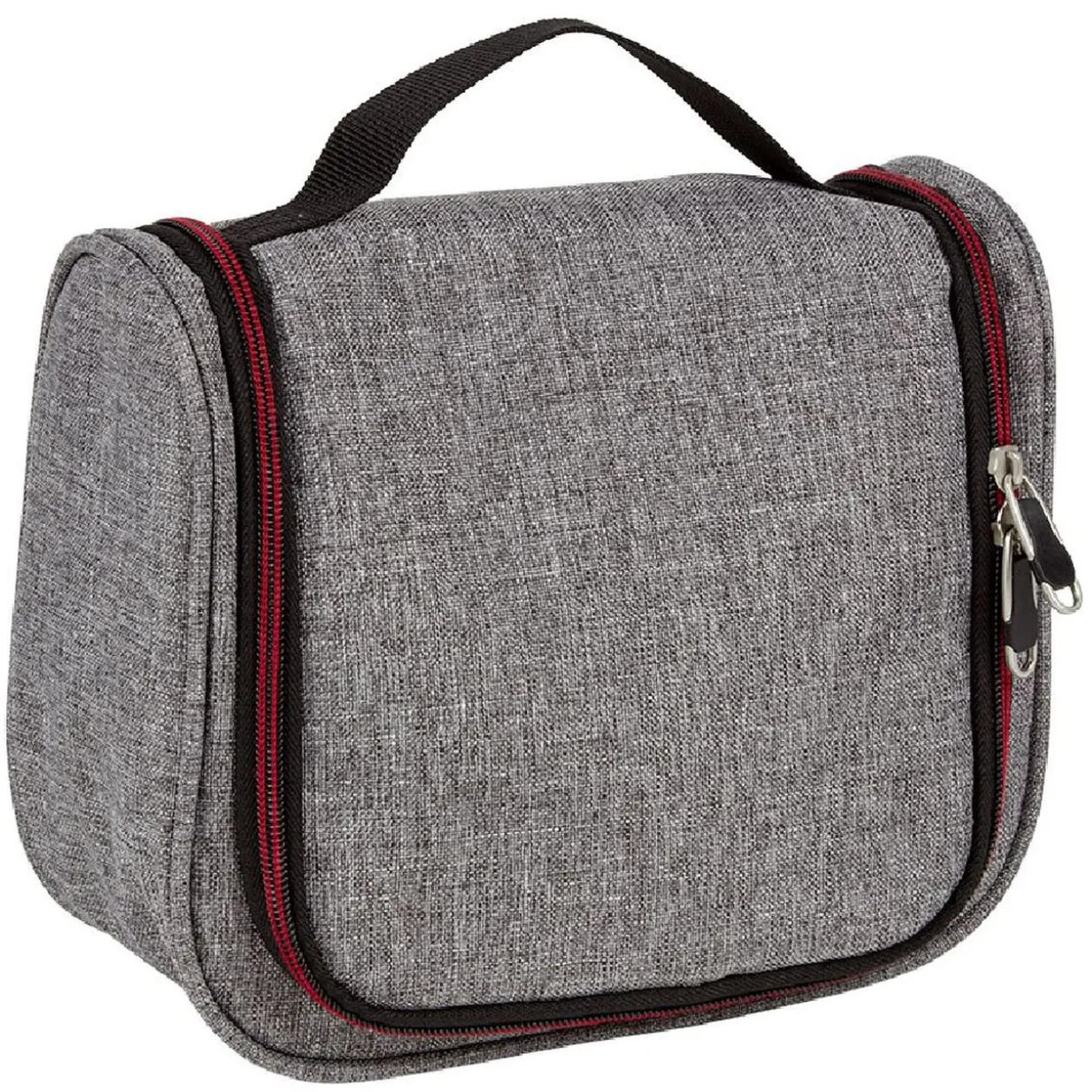Trousse de toilette de couleur grise avec fermeture à glissière rouge et noir.