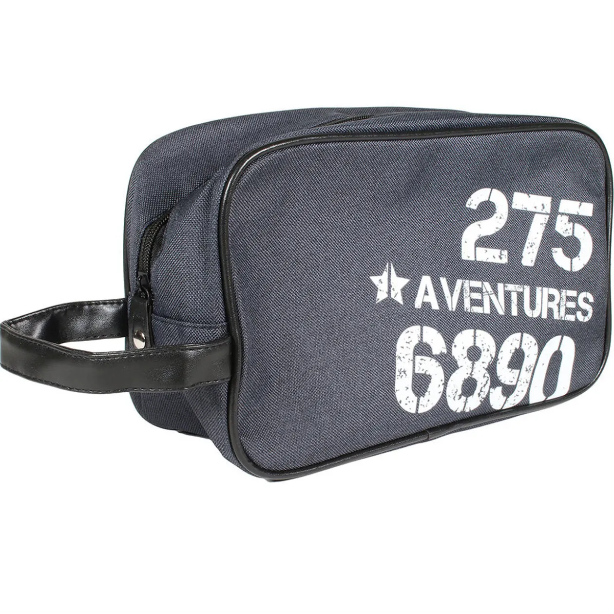 Tousse de toilette grise avec inscriptions blanches : 275 AVENTURES 6890.